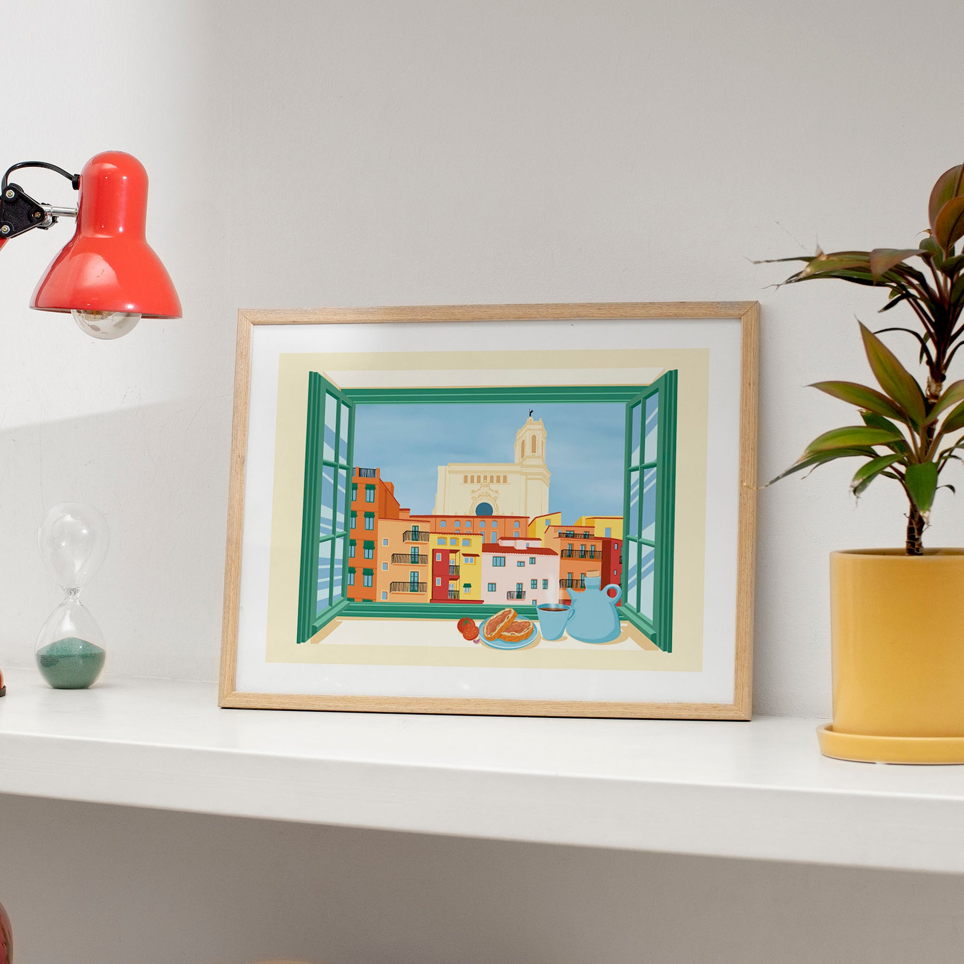 Aquesta il·lustració et convida a gaudir d'un racó únic de Girona des d'una finestra oberta. A l'ampit, detalls quotidians com una setrillera, una tassa i un plat de ceràmica amb torrades de tomàquet evoquen l'essència de la vida mediterrània. Ideal per afegir encant i autenticitat a casa teva.