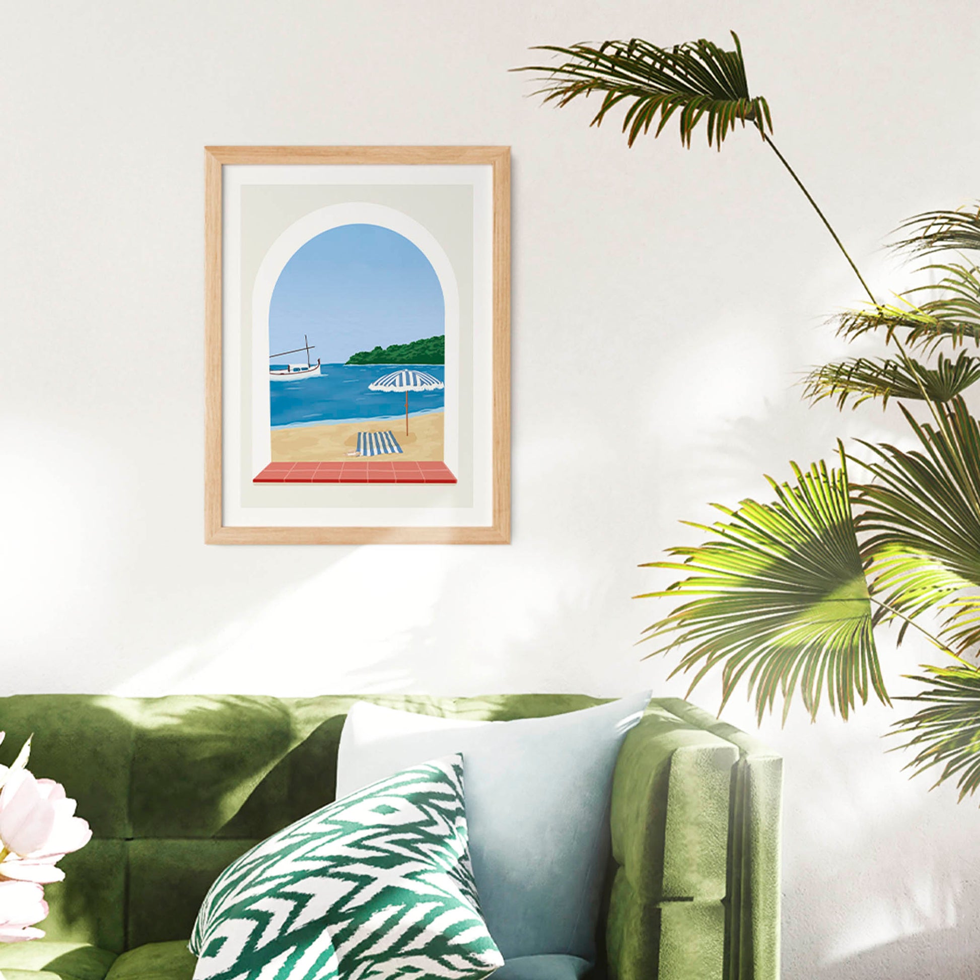 Una escena vista a través d'un arc típic dels poblets blancs de la costa: la platja, una tovallola, un para-sol i una barca navegant a prop de la costa. Aquesta il·lustració captura un moment de calma al costat del mar, típic d´un dia d´estiu a la Costa Brava.