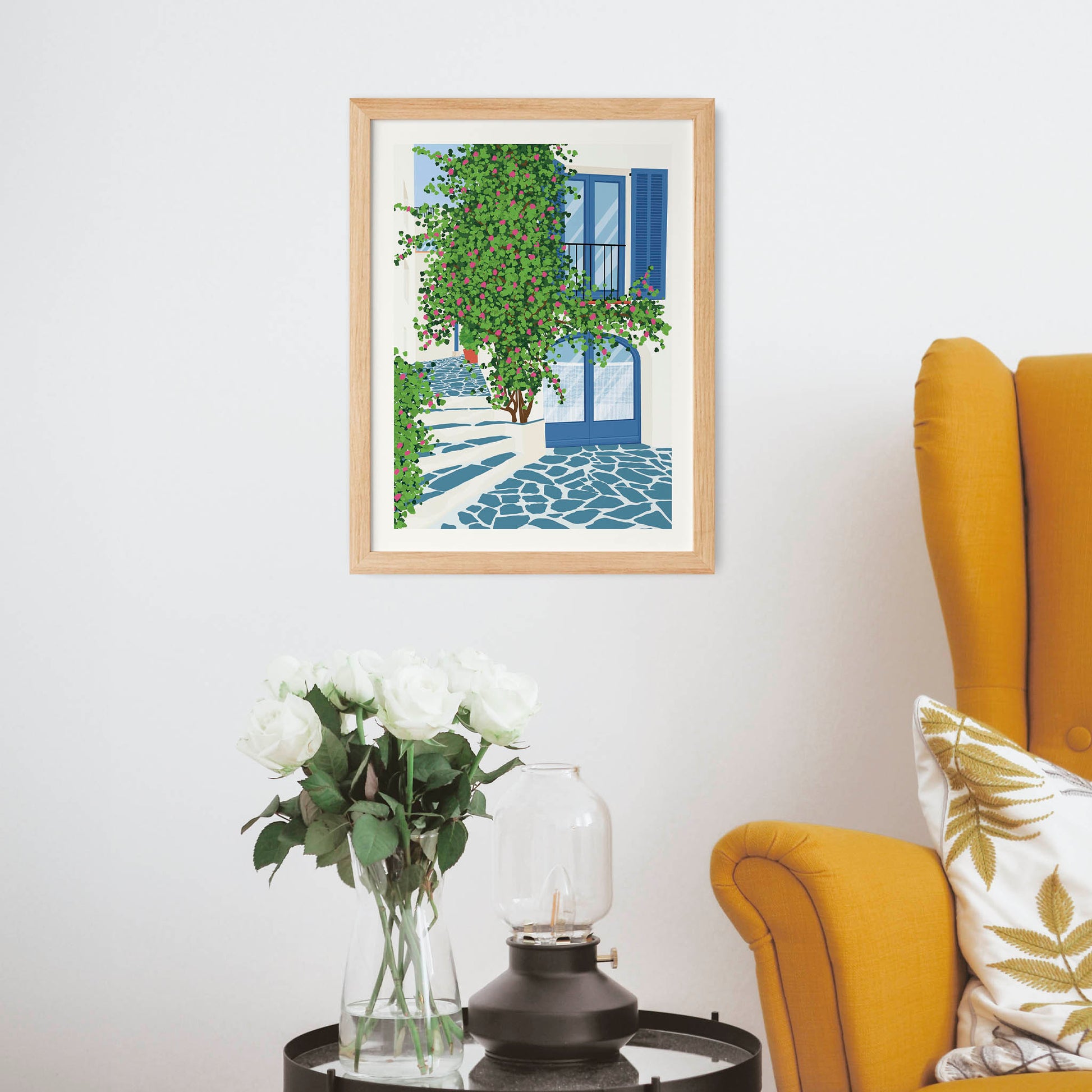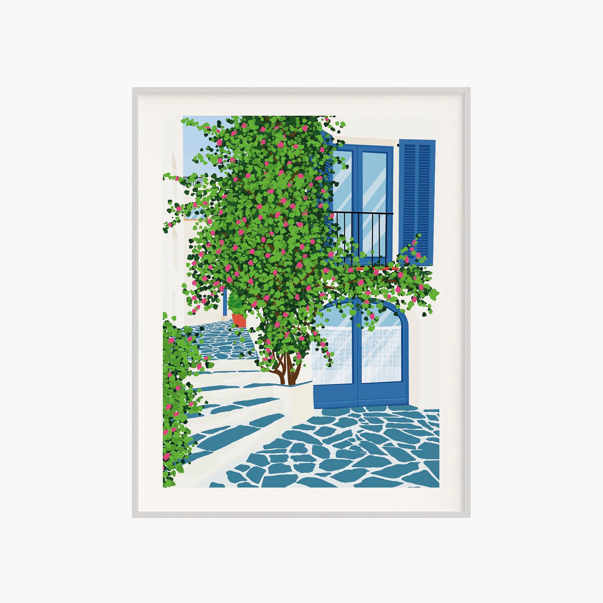 Parets blanques, portes blaves i una buguenvíl·lea en flor: aquesta escena captura l'essència dels pobles costaners de la Mediterrània. La il·lustració representa un carrer típic de la Costa Brava, amb els seus carrers empedrats i racons plens d'encant.