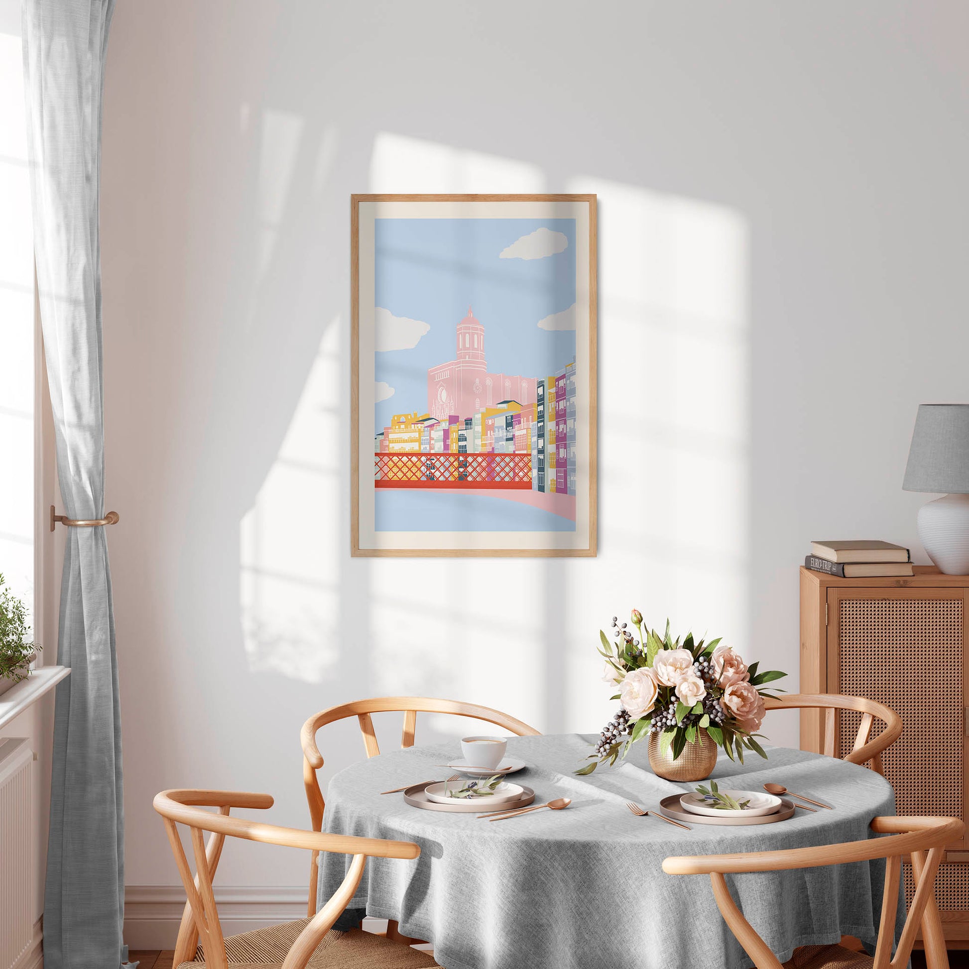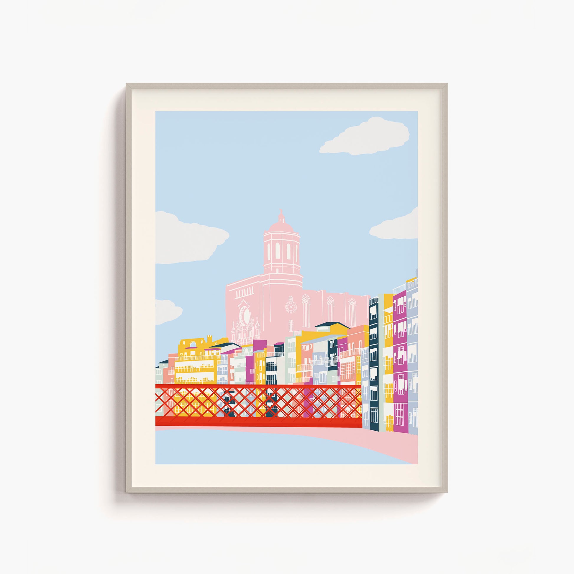 Les vistes al riu Onyar amb les cases de colors és una de les postals més icòniques de la ciutat de Girona. I a més, en aquesta vista, veiem una altra de les icones de la ciutat, el pont vermell dissenyat per la companyia Eiffel.