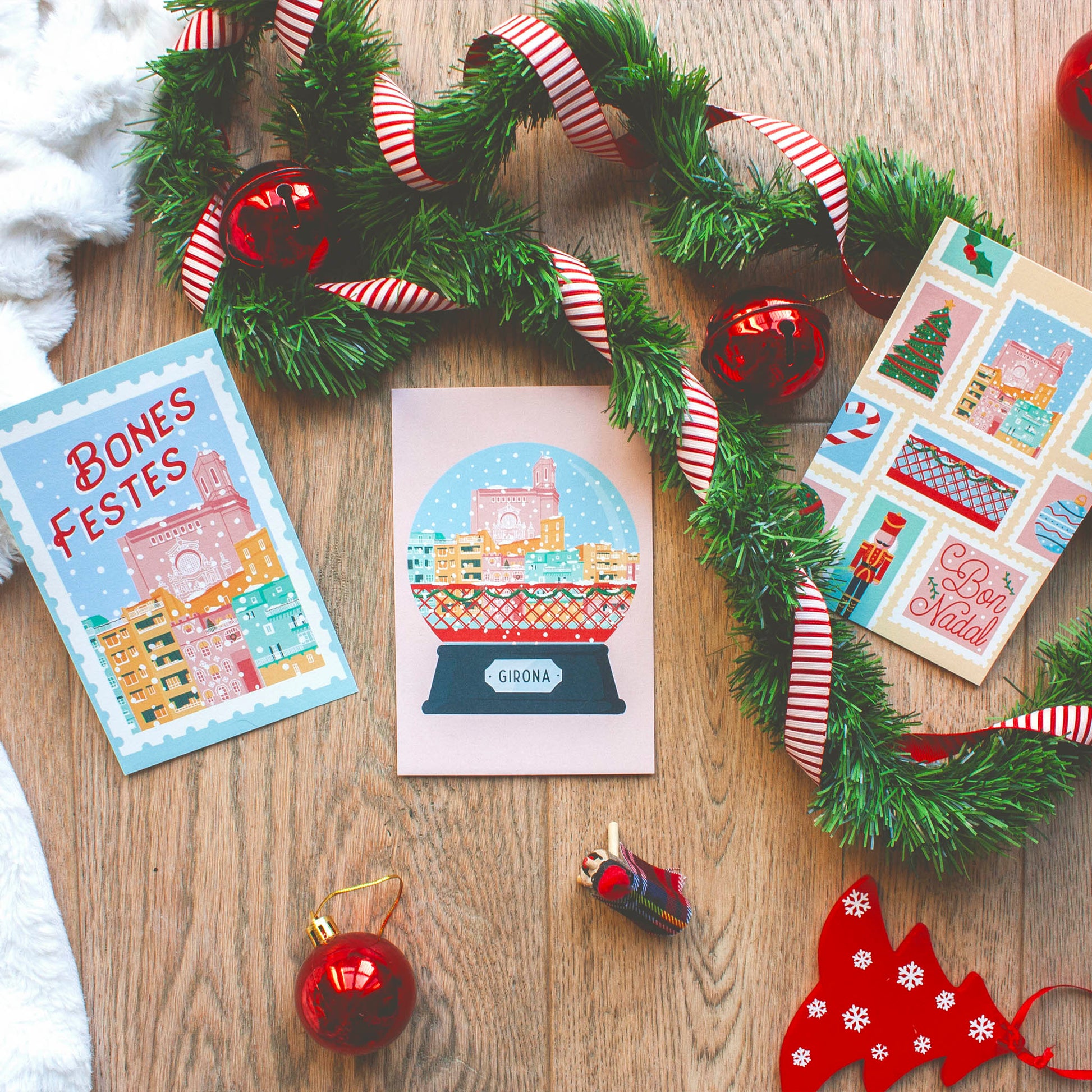 Pack de 3 postales diferentes con ilustraciones de Girona Navideñas; para enmarcar, o enviar a quien quieras con tus mejores deseos.