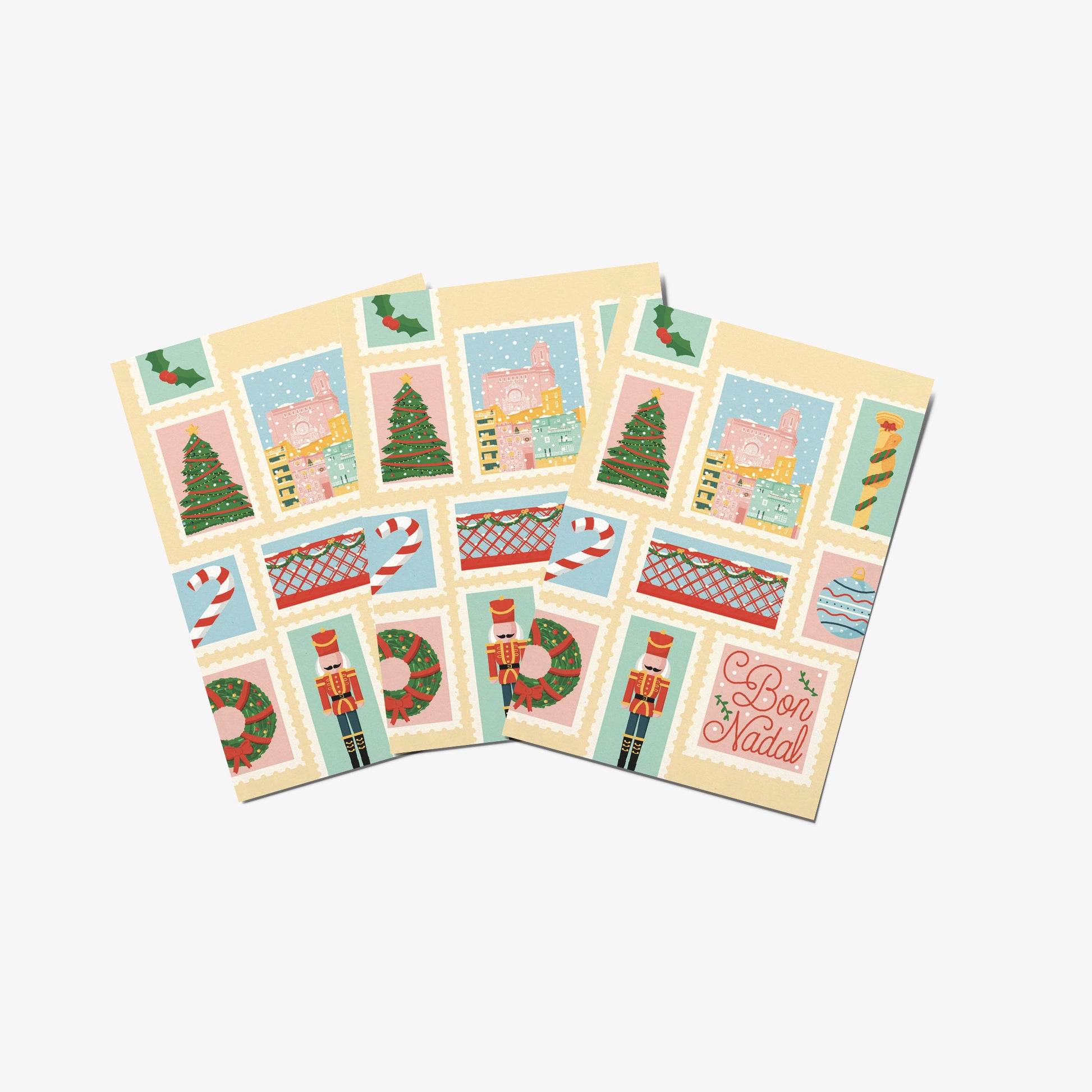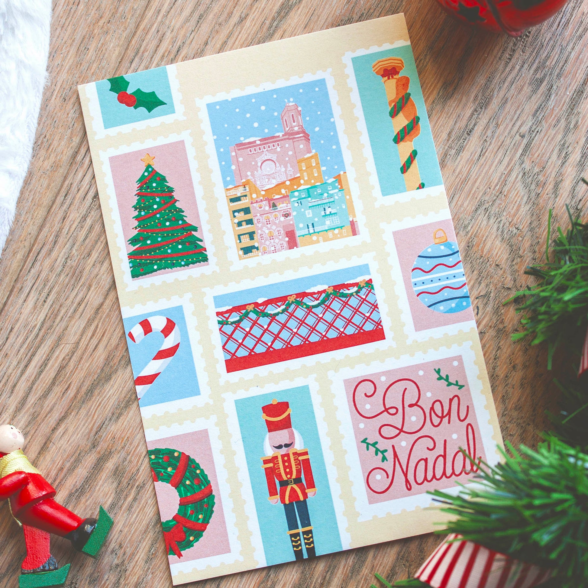 Pack de 3 postales iguales con ilustración de diversos motivos navideños inspirados en Girona; para enmarcar, o enviar a quien quieras con tus mejores deseos.